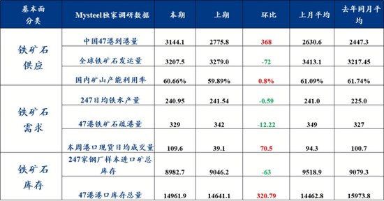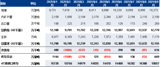 月度平衡表:Mysteel铁矿石分析团队9月30日预计,10月份中国铁矿石市场供大于求,47港铁矿石库存累库。