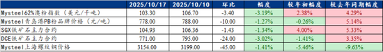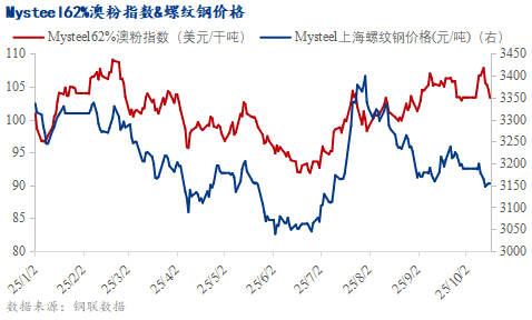 我的钢铁网价格走势方面本周铁矿石价格环比下跌,截至10月17日,Mysteel62%澳粉远期价格指数103.3美元/吨,周环比下跌3.4美元/吨,跌幅3.19%。周内铁矿石价格在103-107美元/吨区间,目前10月均价为104.65美元/吨。本周黑色价格分化切换,煤焦反弹而钢矿下跌。本周市场避险情绪上升,周初黑色价格偏弱运行,而铁矿在中国对美国背景船只收取特别港务费事件的炒作下偏强,14号官方公布具体收费办法后,影响范围大幅缩小,铁矿近期炒作的供应收紧消息多被证伪,价格大幅补跌。