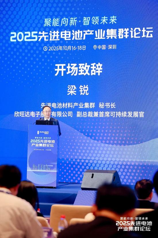 论坛开幕式上,先进电池材料产业集群秘书长、欣旺达副总裁兼首席可持续发展官梁锐发表致辞。他表示,当前全球绿色低碳转型持续加速,新能源产业迎来重要发展机遇。作为产业发展的关键基石,先进电池正步入技术突破、产能升级与生态构建的新阶段。唯有推动协同创新、打破行业壁垒、共建开放生态,才能实现产业链的整体跃升与可持续发展。