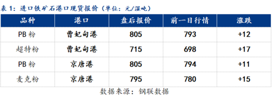表1:进口铁矿石港口现货报价(单位:元/湿吨)