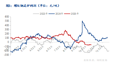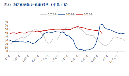 据Mysteel统计,截止2025年10月24日,247家钢铁企业平均盈利率为47.62%,环比下降10.39%,同比下降26.84%。从图2可以看出,截止10月24日,247家钢铁企业平均盈利率为47.62%同比下降8.08%。而目前螺纹钢高炉利润为-57元/吨,环比减少63元/吨,同比减少270元/吨。