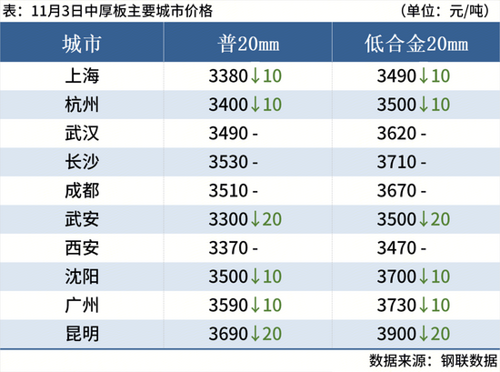 中厚板:11月3日,全国24个主要城市20mm普板均价3464元/吨,较上一交易日下跌8元/吨。市场交投氛围不佳,江阴武安等主要中厚板集散地库存较大,以出库为主,暗降资源较多。下游钢结构客户多以观望为主,采购量较小,其他终端客户市场与钢厂直接定轧较多,一定程度上影响了钢厂对市场流通材的投放速度。多数对后市中厚板看法依旧偏谨慎,目前以保持出货为主。预计4日中厚板价格窄幅震荡运行。