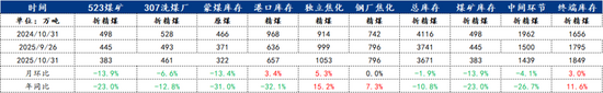 11月安监、“查超产”等政策依然趋严,焦煤供应难以恢复我网调研结果显示,截止2025年10月31日,Mysteel统计523家炼焦煤矿山样本核定产能利用率为84.8%,月环比下降1.7个百分点。原煤日均产量190.3万吨,月环比下降3.8万吨,原煤库存431.6万吨,月环比下降12.3万吨 ,精煤日均产量75.8万吨,月环比下降1.6万吨,精煤库存164.6万吨,月环比下降27万吨。从调研数据来看,煤矿10月份产量继续维持低位,“查超产”对煤矿产量影响仍在,尤其是央国企煤矿,临近年底部分完成任务煤矿有逐步减产计划。同时由于下游铁水产量不减,刚需补库需求仍在,市场买涨不买跌的心态,短期煤炭越是紧张下游买盘就越强劲,煤价持续偏强。