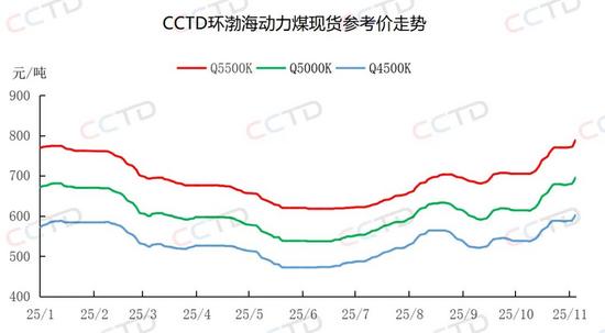 本周以来,随着产地市场煤价持续快速上涨,贸易商发运到港成本上升,加之中下游环节煤炭库存处于同比偏低水平,市场看涨情绪不断升温,卖方报价涨幅逐步扩大。截至11月5日,“CCTD环渤海动力煤现货参考价”5500K、5000K、4500K三个规格品价格分别收于788、695、602元/吨,日环比分别上涨9、9、8元/吨,较前期低点分别上涨18、18、15元/吨,较年初高点均上涨14元/吨。