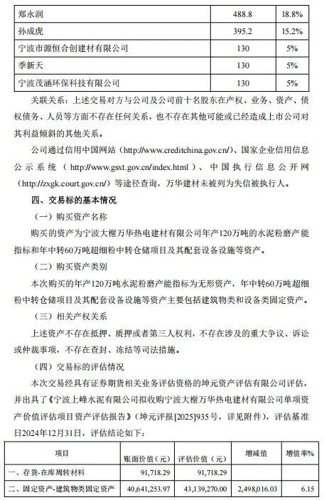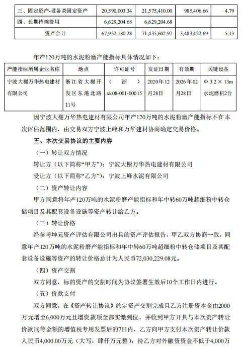 本次增资资金主要是用于永信港埠码头技改工程和收购宁波大榭万华热电建材有限公司年产120万吨的水泥粉磨产能指标和年中转60万吨超细粉中转仓储项目及其配套设备设施等资产,上述资产合计收购金额为7203万元。