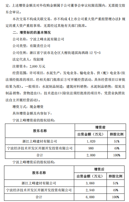 上峰建材与宁波开源拟按出资比例以现金方式合计对宁波上峰增资4000万元,增资完成后,宁波上峰注册资本金由增资前的2000万元变为6000万元。