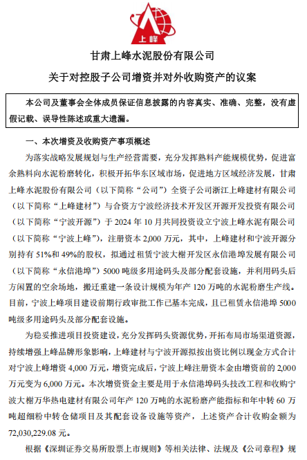 11月5日,上峰水泥发布《关于对控股子公司增资并对外收购资产的议案》显示,公司全资子公司浙江上峰建材有限公司与合资方宁波经济技术开发区开源开发投资有限公司于2024年10月共同投资设立宁波上峰水泥有限公司,注册资本2000万元。