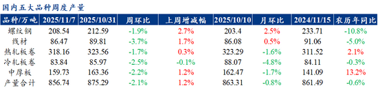 供应方面,本周五大钢材品种供应856.74吨,周环比下降18.55万吨,降幅2.1%。本周五大钢材品种产量周环比均有所下降,核心驱动在于,钢厂利润有所收缩,部分钢厂有所检修。