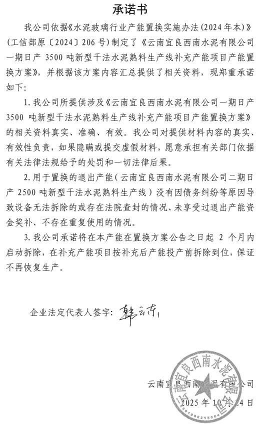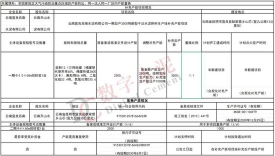 根据公示,云南宜良西南水泥有限公司一期日产3500吨新型干法水泥熟料生产线补充产能项目原备案产能日产2500吨,按照实际生产能力,补充增加产能日产1000吨,补充后产能日产3500吨,置换比例为1:1。该公司一条2500t/d水泥熟料生产线中的1000t/d用于本项目置换产能。该生产线将在本产能在置换方案公告之日起2个月内启动拆除,在补充产能项目按补充后产能投产前拆除到位,保证不再恢复生产。