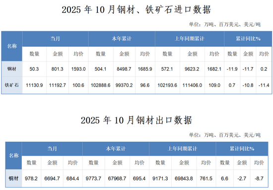 2025年10月,我国进口铁矿石1130.9万吨,环比减少501.7万吨、降幅4.3%;均价100.6美元/吨,环比上涨3.6美元/吨、涨幅3.7%。1—10月,累计进口铁矿石102888.6万吨,同比增加695.0万吨、增幅0.%。