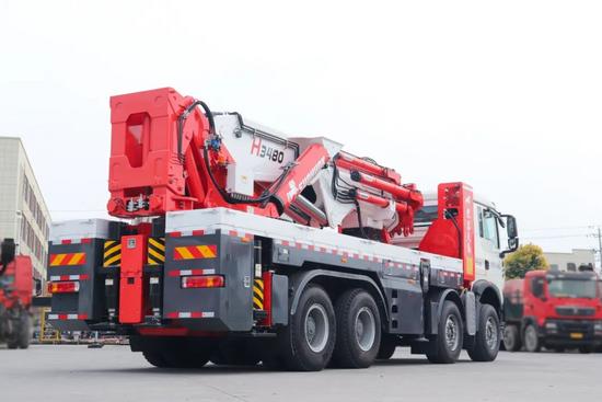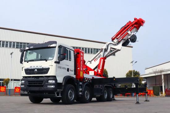 八节伸缩臂臂长21.3m,双泵系统,搭配宏昌天马自主研发J40飞臂,最大吊重可达9t,整体臂长可达38.7m,适应各种上楼及跨域厂房工况