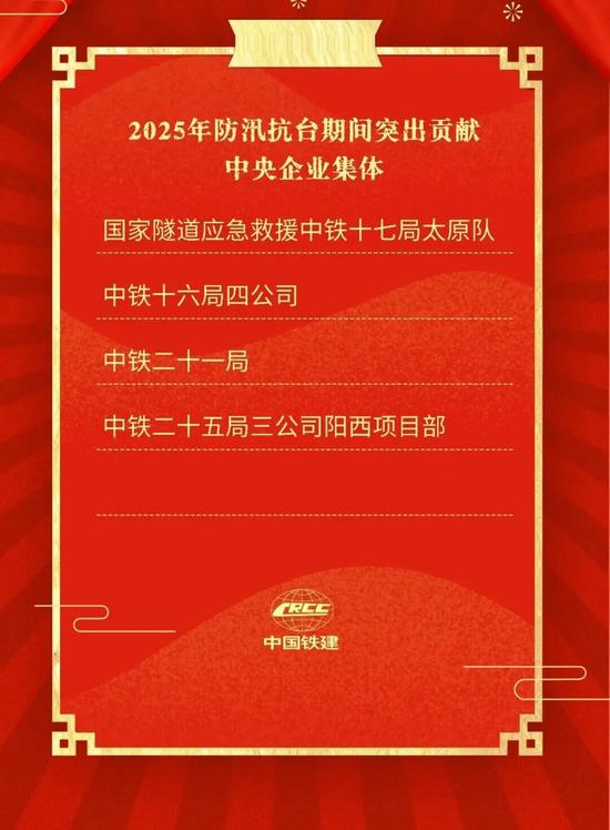 近日,国务院国资委党委通报表扬2025年防汛抗台期间突出贡献中央企业集体,中国铁建所属国家隧道应急救援中铁十七局太原队、中铁十六局四公司、中铁二十一局、中铁二十五局三公司阳西项目部等4个集体光荣上榜,以实际行动展现了中央企业的先锋力量。