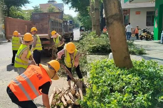 来不及休息,队伍又赶赴被倒树阻断的迎宾大道与湖景路。两条城区主干道由于堆积的倒塌树木陷入瘫痪,阻碍车辆通行与救援,夜色中队员们奋战三小时,一条畅通的“生命通道”终于被打通。
