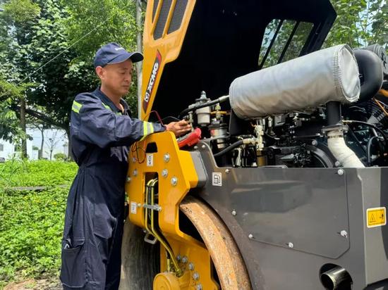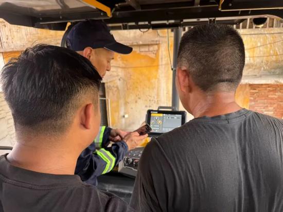 刚结束一天工作的张周,突然接到韶关武江区工地的紧急电话。一台摊铺机的发动机出现启动困难、自动熄火,整个施工进度陷入停滞。他接到电话后二话不说,立即出发。从广东佛山到韶关工地,他仅用三个多小时就赶到现场。顾不上一路疲惫,他打着手电筒连夜排查机器。