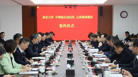 11月8日下午,山东铁投集团与南京大学、中科院自动化研究所在集团总部大楼签署合作协议并座谈交流。南京大学党委书记、中国科学院院士谭铁牛,党委常委、校长助理、学校办公室主任李斌,山东省科技厅党组成员、省创新发展研究院党组书记、院长刘峰,中科院自动化研究所党委委员、副所长吕品,山东铁投集团党委书记、董事长王卫中,党委副书记、总经理高立平,党委委员、副总经理杨俊泉、赵春雷出席活动。集团党委副书记乐江华主持。