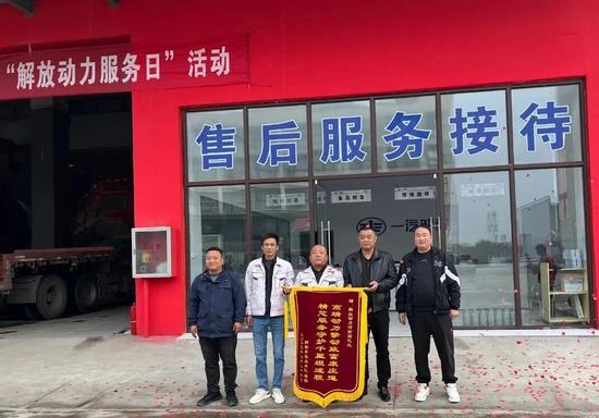 河南商代处服务站点前,桐柏车队代表将一面锦旗郑重送到工作人员手中,鲜红的旗面绣有“高端动力擎动致富康庄道,精芯服务守护千里坦途程”的字样,以此表达对解放动力“精芯服务”的高度认可。桐柏车队长期运行在河南、山东等区域,每次车辆故障维修、零件保养车队全部在解放动力服务站内进行,目前车队累计20多台车辆出勤率达到96%以上,车队负责人李长生表示当前市场环境压力不小,但解放动力的服务与支持,让他们坚定了选择解放的信心。