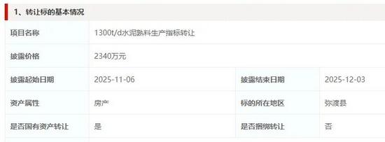 近日,根据相关产权交易平台发布的信息显示,华润水泥(弥渡)有限公司1300t/d水泥熟料生产指标转让,转让底价为2340万元。