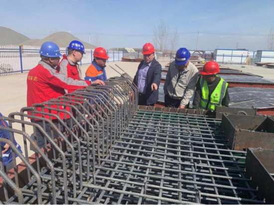 ▲甫尔海提·艾尼瓦尔(右三)在对装配式桥梁桥面板操作进行指导