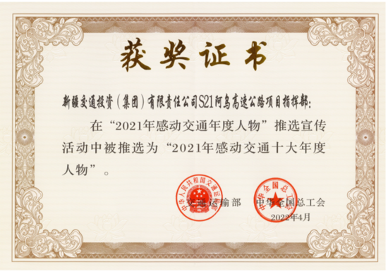 ▲甫尔海提·艾尼瓦尔参与过的新疆交通投资(集团)有限责任公司S21阿乌高速公路项目指挥部曾在“2021年感动交通年度人物”推选宣传活动中被推选为“2021年感动交通十大年度人物”。