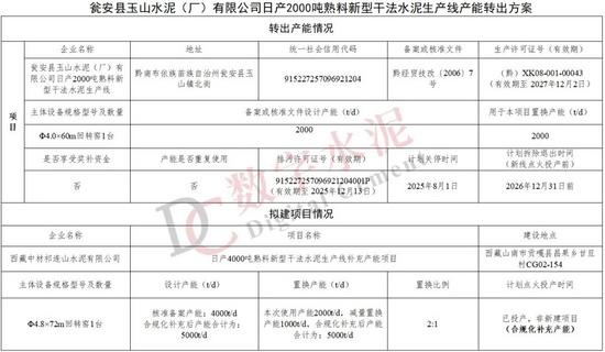 11月10日,贵州省工业和信息化厅发布《关于瓮安县玉山水泥(厂)有限公司日产2000吨新型干法水泥生产线产能转出方案的公示》称,根据《水泥玻璃行业产能置换实施办法(2024年本)》(工信部原〔2024〕206号)文件要求,现对瓮安县玉山水泥(厂)有限公司日产2000吨熟料新型干法水泥生产线产能转出方案进行公示。