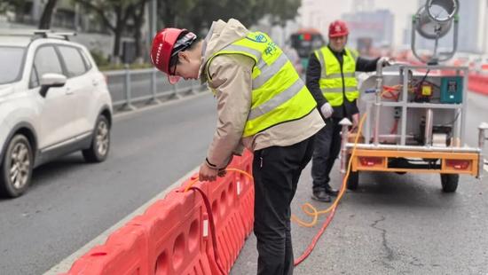 在导改现场,项目部党员干部带头主动与路政、交警、公路管理等单位及当地政府密切协作,设立多个交通疏导点,有序开展围挡架设、机械指挥等工作,引导车流安全避开施工路段。项目员工轮流坚守桥面岗位,不间断往返南北两侧,实时校正导改水马,保障社会车辆通行顺畅。