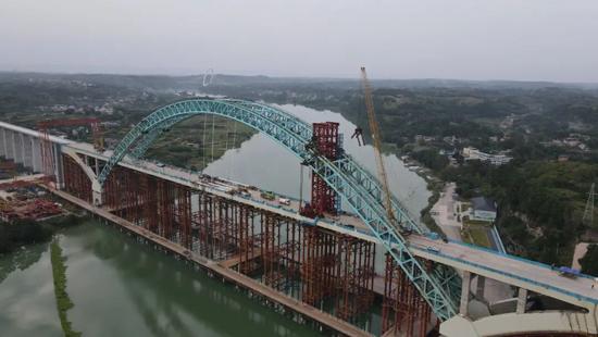 记者从长江沿岸铁路集团四川有限公司获悉,11月10日,在12台600吨连续千斤顶3小时作业后,成渝中线高铁控制性工程沱江特大桥实现全桥合龙,成为全球最大跨度无推力组合拱桥。