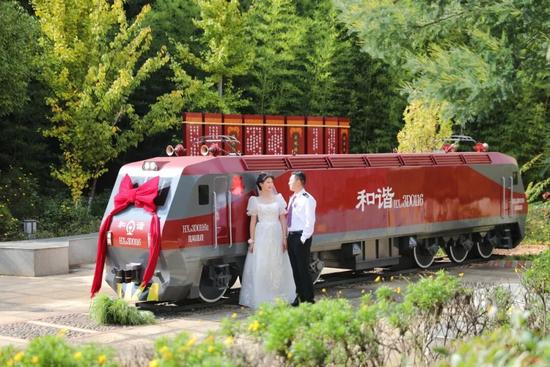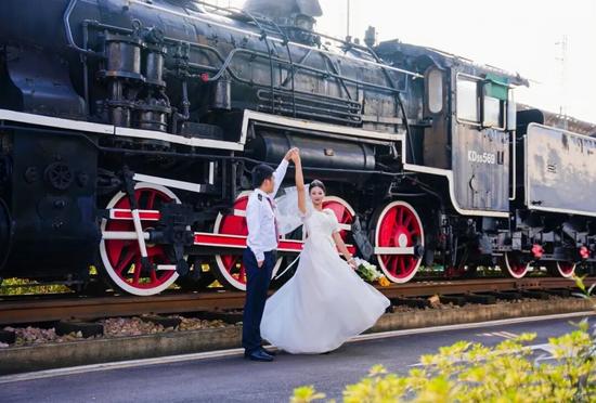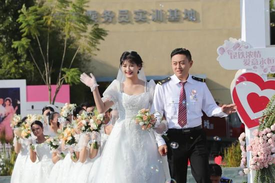 新人们身着铁路制服和白色婚纱依次步入婚礼现场