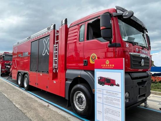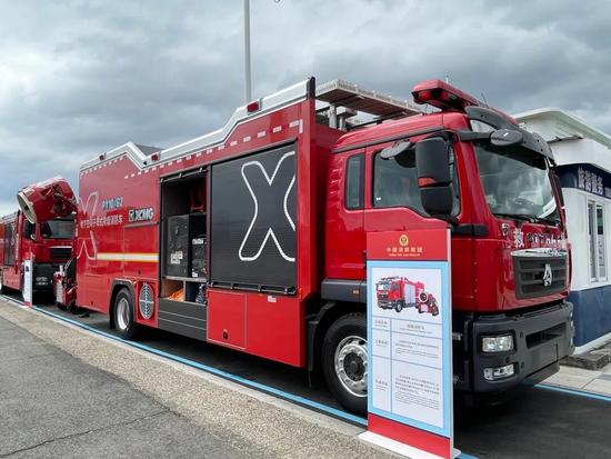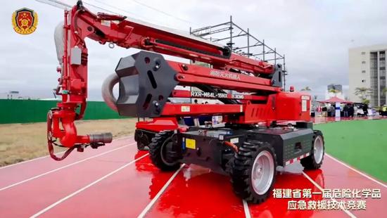 万升大流量举高喷射消防车举高消防机器人亮相福建省第一届危险化学品应急救援技术竞赛的救援装备展。