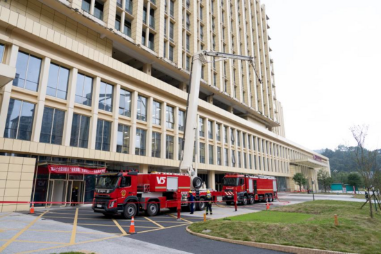 62米举高喷射消防车参与保障雅安人民医院模拟医养中心突发火灾逃生演练