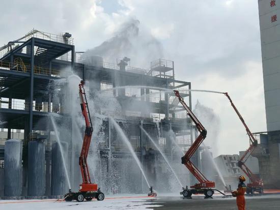 在绍兴,浙江省首届应急救援力量大比武暨新装备演示活动成功举办。化工装置火灾实战化演示现场,浓烟滚滚,火势汹涌,多台徐工轮式举高消防机器人与各类灭火装备协同作战,瞄准起火点展开多点攻击,有效控制火势蔓延。