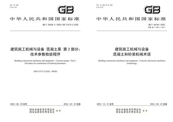 中联重科此次牵头编制的两项国家标准分别是GB/T 25638.2-2025《建筑施工机械与设备 混凝土泵 第2部分:技术参数的检验程序》和GB/T 46760-2025《建筑施工机械与设备 混凝土和砂浆机械术语》。