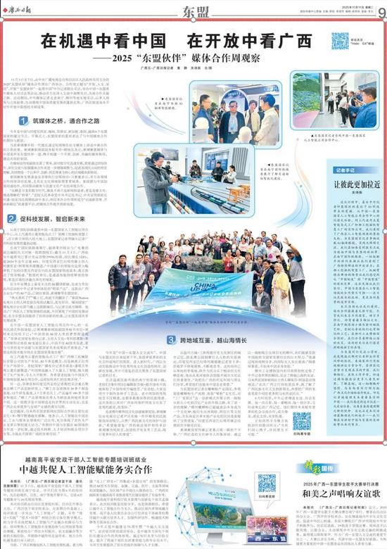 此外,11月11日,广西日报以《在机遇中看中国 在开放中看广西》为题报道2025“东盟伙伴”媒体合作周活动。其中,东盟媒体视角聚焦柳