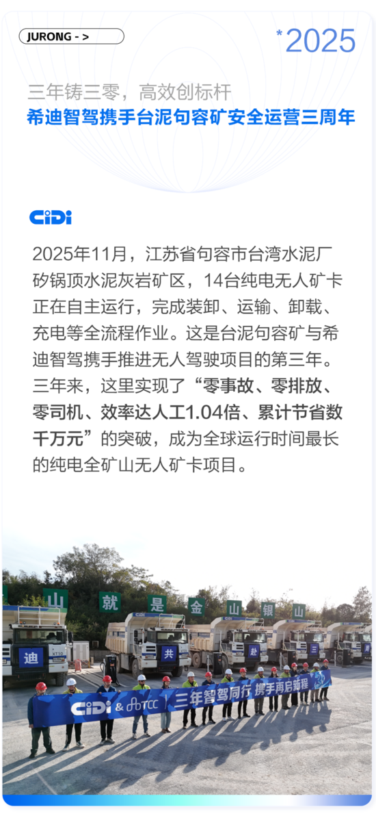 这场双向奔赴的共研实践,不仅让台泥句容矿成为智慧矿山的标杆范本,更印证了希迪智驾技术落地的硬核实力。