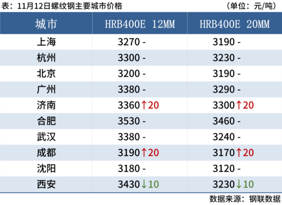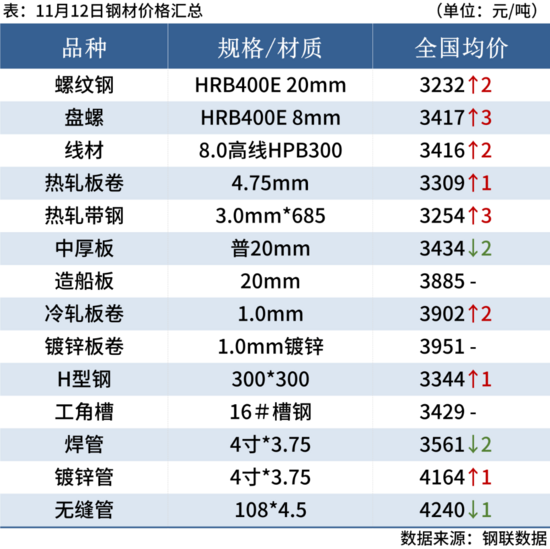 螺纹钢:11月12日,全国31个主要城市20mm三级抗震螺纹钢均价232元/吨,较上个交易日元/吨。伴随着市场进入消费淡季,需求减量较为明显。不过随着目前钢厂多数亏损,停产、减产增加,一定程度上缓解供应压力同时焦钢博弈持续,市场情绪回落导致双焦期货盘面下跌,预计13日国内建筑钢材价格或延续窄幅震荡运行。