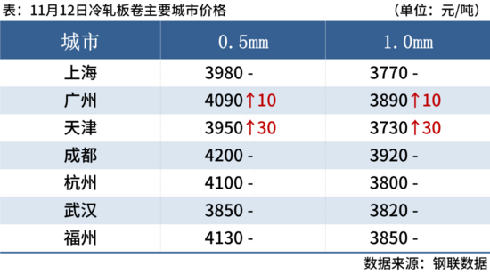 冷轧板卷:11月12日,全国24个主要城市1.0mm冷卷均价3902元/吨,较上个交易日涨2元/吨。市场商户报价持稳为主,盘中交易氛围相对一般,进入冬季下游需求有转弱趋势,商家对后期行情谨慎度增加,致使市场资源流转活跃度低,成交多以终端刚需补库为主,预计13日全国冷轧板卷价格平稳运行为主。