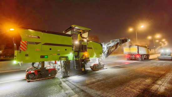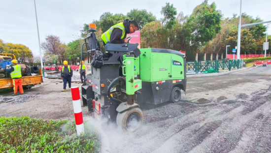 广州大学城路面4cm沥青路面铣刨工程,考虑到学校周边低噪要求、白天施工道路无法全封闭导致的空间受限问题。采用徐工XM505EP轻量化半米纯电铣刨机,转场灵活,噪声极低。300㎡铣刨作业仅耗时3.2小时,电池电量仅下降48%(约72kWh),使用成本较燃油铣刨机降低约2/3,精准匹配校园周边施工需求。