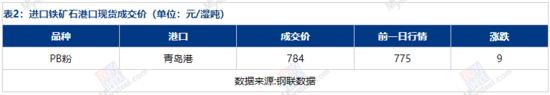 今日山东进口铁矿石现货市场价格偏强运行,成交较少。具体来看,今日上午价格较上一工作日价格偏强运行,卖盘方面,贸易商报盘积极性一般;远月市场询报较少;买盘方面,钢厂维持按需补库,区域内个别钢厂有招标计划。午后铁矿石现货市场价格持稳运行,市场交投氛围一般,成交较少。