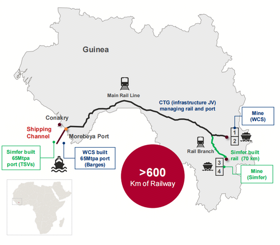 南部区块则由Simfer公司主导,力拓集团与中铝铁矿控股有限公司为首的中方联合体共同参与,铁矿石储量为28亿吨,铁品位约65.5%。