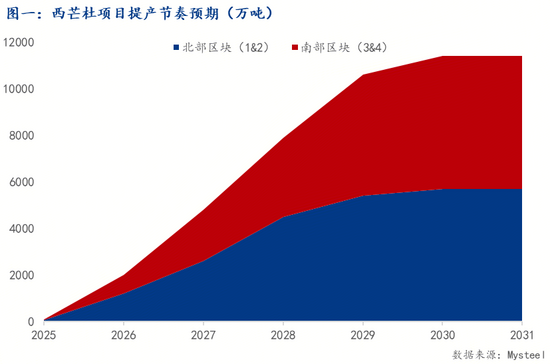 Mysteel预测西芒杜项目将在“十五五”期间逐步释放产能,具体提产进程参见图一,考虑到基础设施差异和权益背景等各方面因素,我们认为北部矿区的整体投产节奏相对更快。