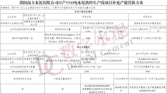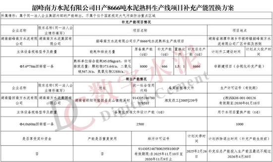 邵阳南方水泥有限公司日产5500吨水泥熟料生产线项目原备案产能4500t/d,补充产能1000t/d,补充后产能5500t/d,置换比例为1.5:1。