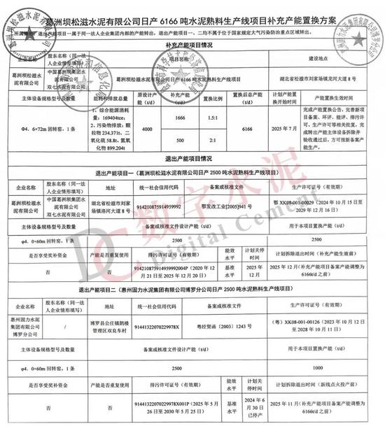 根据公示,葛洲坝松滋水泥有限公司日产6166吨水泥熟料生产线项目原设计产能4000t/d,置换后总产能6166t/d,置换比例分别为1.5:1和2:1。该公司2500t/d水泥熟料线和惠州固力水泥集团有限公司博罗分公司2500t/d水泥熟料线中的1000t/d分别用于本项目置换产能。