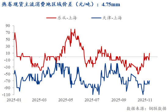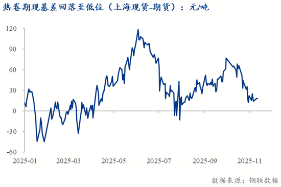 1)华东地区社库逆势累积: 11月起华东热卷社库超预期累积,主要由于华北、华南主流消费市场库存压力较大,导致当地价格跌幅大于其他地区,而华东地区仍具区域价格优势;同时,华东热卷期现基差降至低位,带动部分期现需求,共同吸引外部低价资源持续流入,推动当地库存明显回升。