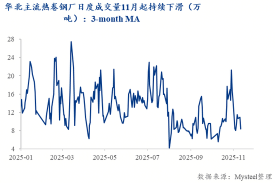 与此同时,市场信心与投机需求亦显不足。部分钢厂反馈接单节奏放缓,接单量环比下降约一成;同时,下游制造业企业的钢材原料库存也普遍环比回落,反映下游企业囤货意愿走弱。在此背景下,11月热卷全样本表观需求被压制在650万吨左右的低位水平震荡,需求瓶颈是库存无法有效去化的另一关键