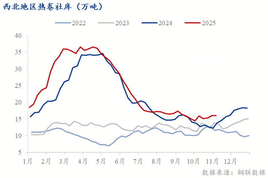 2)西北地区部分钢厂开启冬休,市场供应压力减弱下库存绝对量以及累库压力边际走弱:Mysteel调研显示,进入11月,乌鲁木齐及大部分北疆区域2025年底第二场雨雪天气来临,当地市场陆续计划从11月中旬至12月初开启冬季检修计划,同时由于冬季交通运输不便,原料进厂受到一定影响,预计冬季西北地区钢厂将处于不饱和生产状态,当地供应增长受限下,库存压力或将有所缓和。