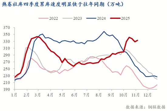 11月热卷价格在经历10月末短暂拉涨后重回跌势,触及下半年低点。随着宏观面驱动减弱,市场交易逻辑重新聚焦于基本面,核心矛盾直指持续高位的供应与渐显疲态的需求之间的失衡,这一矛盾直接导致社会库存逆季节性累积,并不断挤压钢厂利润。