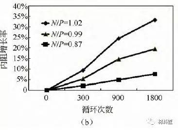 ③正负极循环的衰减速率:如果正极衰减快,那么N/P比设计低些,让正极处于浅充放状态,反之如果负极衰减快,那么N/P比高些,让负极处于浅充放状态