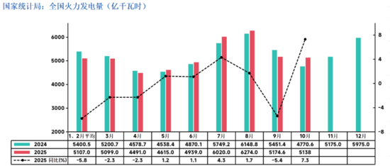 其中,火力发电量为5138亿千瓦时,同比增长7.3%,为年内最高增幅,体现了在负荷上行阶段火电“兜底”“稳供”的关键作用。根据 CCTD监测数据,沿海8省动力煤终端用户10月日均耗煤量同比增长9%,在节后需求快速回升的背景下推动煤价出现明显上涨,使10月呈现“淡季不淡”的特征。但从累计数据看,1—10月火电发电量同比仍为-0.4%,新能源出力偏强对火电仍然形成明显挤压。