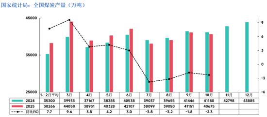 10月份北方降水显著偏多,对露天煤矿生产和煤炭运输造成一定扰动。同时,超产核查仍在推进,叠加四季度安监力度惯常加大,多重因素共同导致产量环比停止增长、同比降幅扩大。在此背景下,短期煤炭供应大概率延续偏紧态势,全年原煤累计增速或进一步降低。
