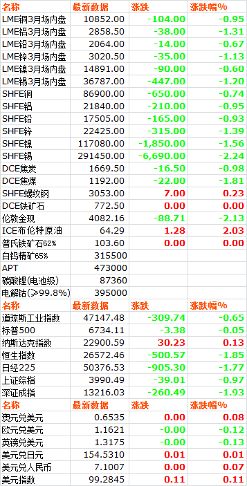 1114日,LME六种基本金属价格全线下跌。三月期铜价收于10852美元吨,下跌0.95%。三月期铝价收于2858.5美元吨,下跌1.31%。三月期铅价收于2064美元吨,下跌0.67%。三月期锌价收于3020.5美元吨,下跌1.13%。三月期锡价收于36787美元吨,下跌1.20%。三月期镍价收于14891美元吨,下跌0.60%