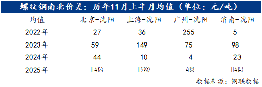 截止发稿,11上半月螺纹北京-沈阳价差142/吨,上海-沈阳价差129/吨,广州-沈阳价差48/吨,济南-沈阳价差145/吨。年同比来看,北京价差继续走扩,较去年的-44/吨扩大至142/吨,扩幅达186/吨,为东北材南下价差最优之地;上海价差同样继续走扩,由去年同期的-10/吨扩大至129/吨,虽与运费相比仍有差距,但较上月同期走扩值还在好转,加之东北材消化在即,故11月上海计划投放量高于10月;广州价差有所扩大,由去年同期的-4元/吨扩大至48/吨但较运费仍差距甚远,故钢厂仍未选择将资源发往此地;济南价差明显走扩,由去年同期的-23/吨扩大至145/吨,但考虑到需求实况,11月东北材仍暂未有投放至此的计划。